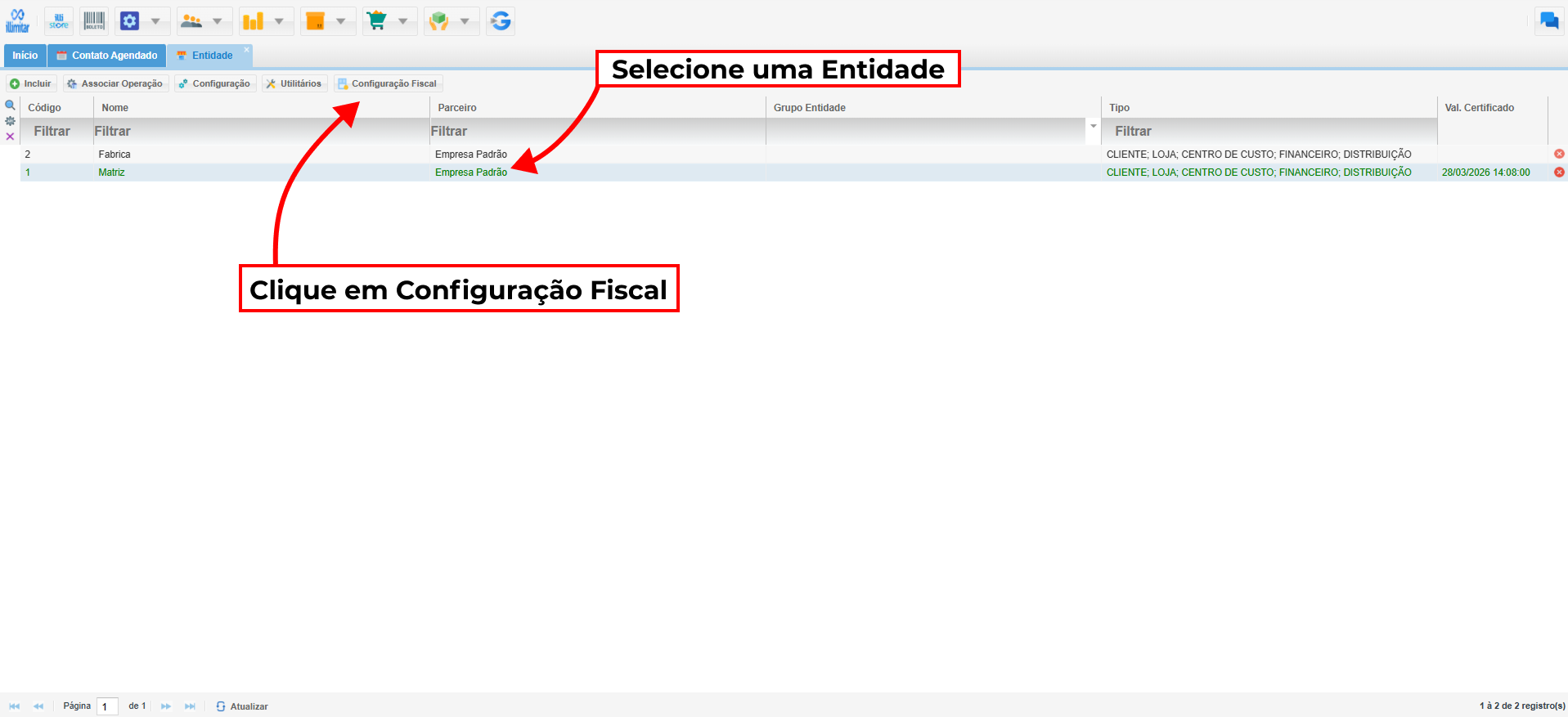 Selecione uma Entidade e, em seguida, o botão Configuração Fiscal.