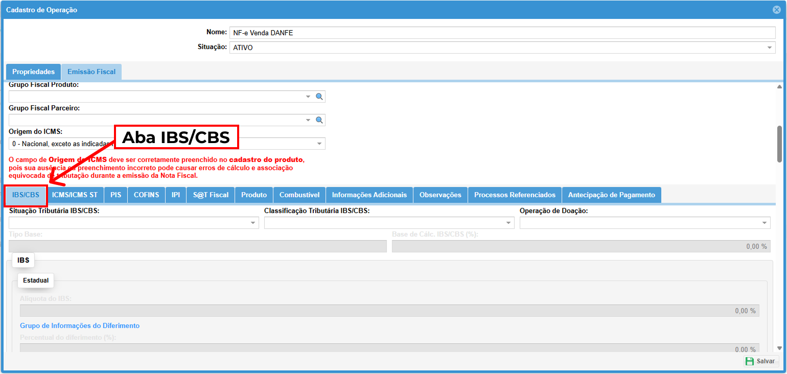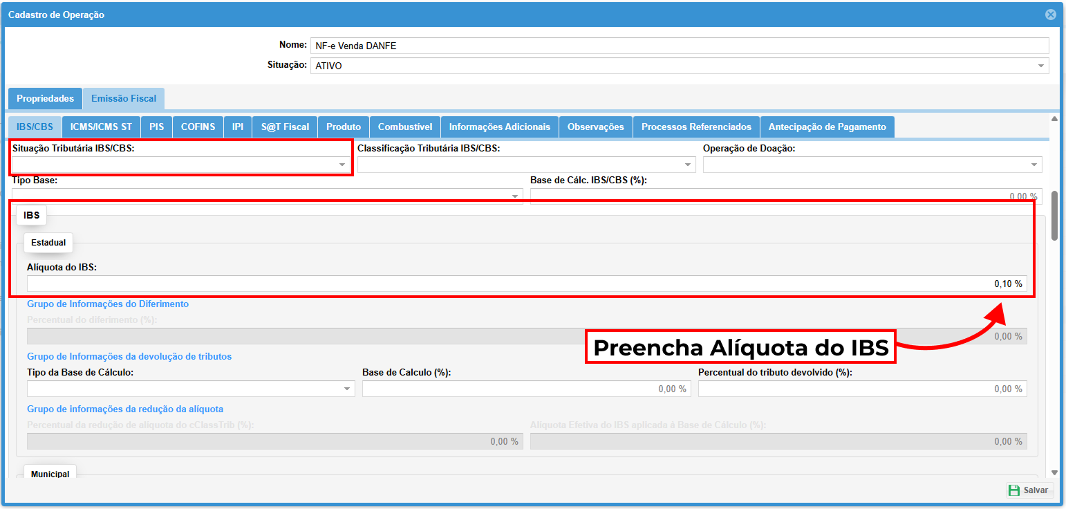 - Os campos habilitam após o preenchimento da Situação Tributária IBS/CBS: