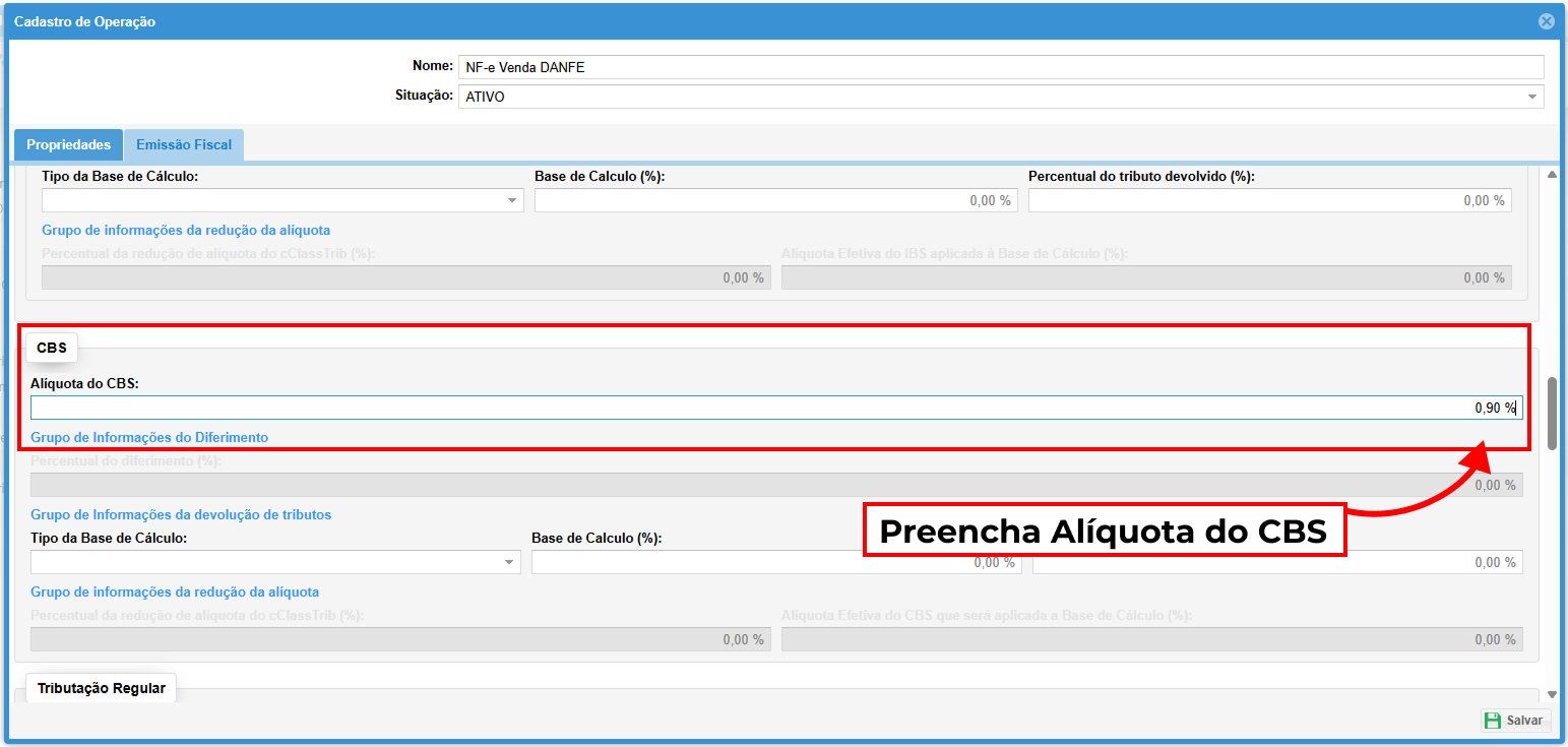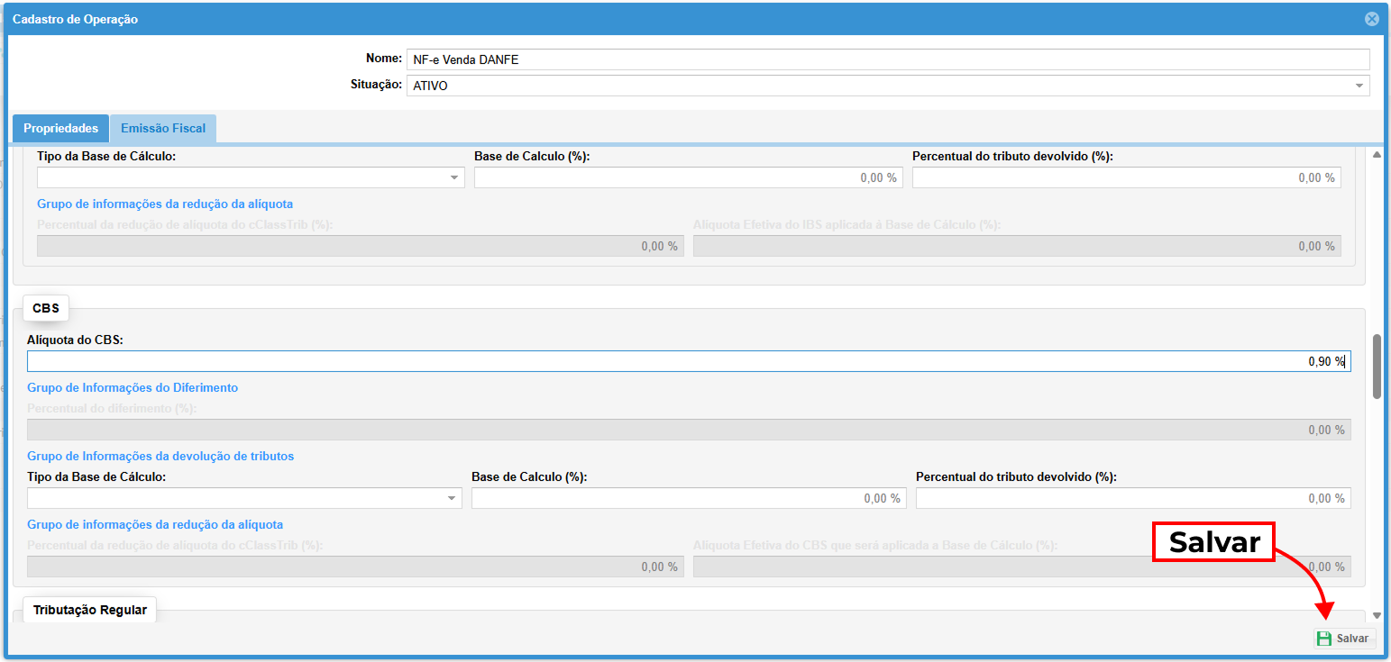 Nesta etapa, definiremos os valores padrões iniciais para os novos impostos. O preenchimento destes campos específicos é obrigatório para que o sistema valide a estrutura da nota fiscal.