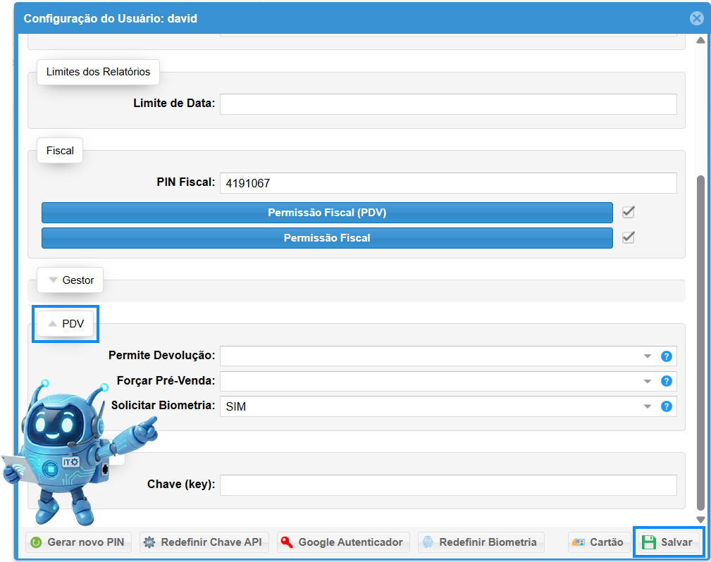 Na janela que se abrir, clique na aba PDV. Altere a opção Solicitar Biometria para SIM. Clique em Salvar.