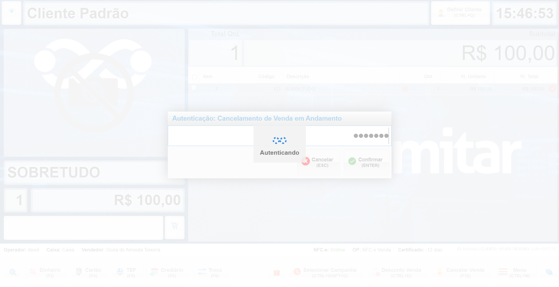 Após a sincronização do caixa, utilize o PIN Fiscal do usuário habilitado.