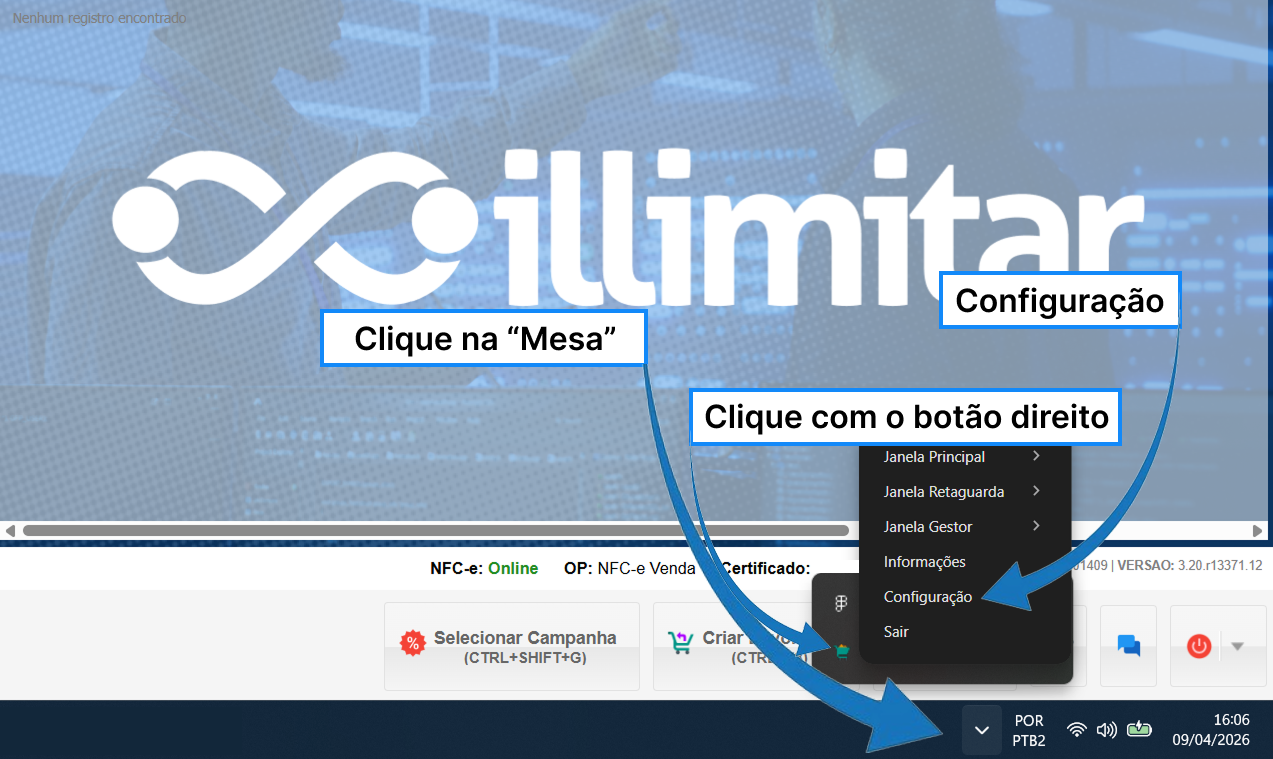 Com o PDV aberto, clique na mesa e com o botão direto do seu mouse em cima do carrinho, em seguida, na opção Configuração.