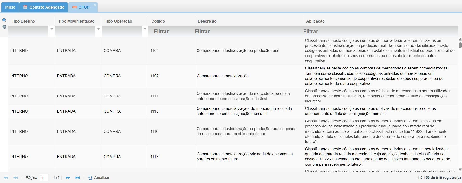Na tela principal do módulo, você encontrará uma lista completa dos códigos CFOP disponíveis. A lista é organizada com filtros para facilitar a busca. Os filtros incluem: