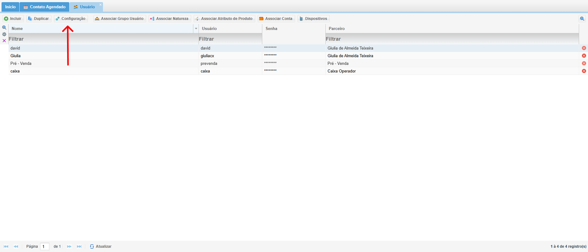 - Com o usuário selecionado, clique na opção "Configuração" para acessar as configurações detalhadas desse usuário.