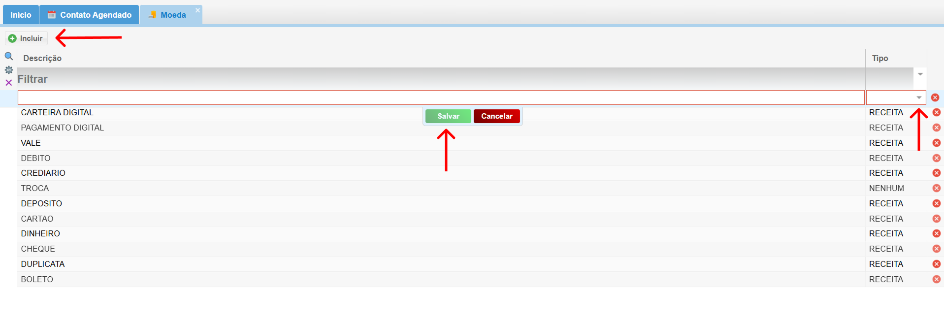 - Após preencher os campos obrigatórios e opcionais, clique no botão Salvar para concluir o cadastro da nova moeda.