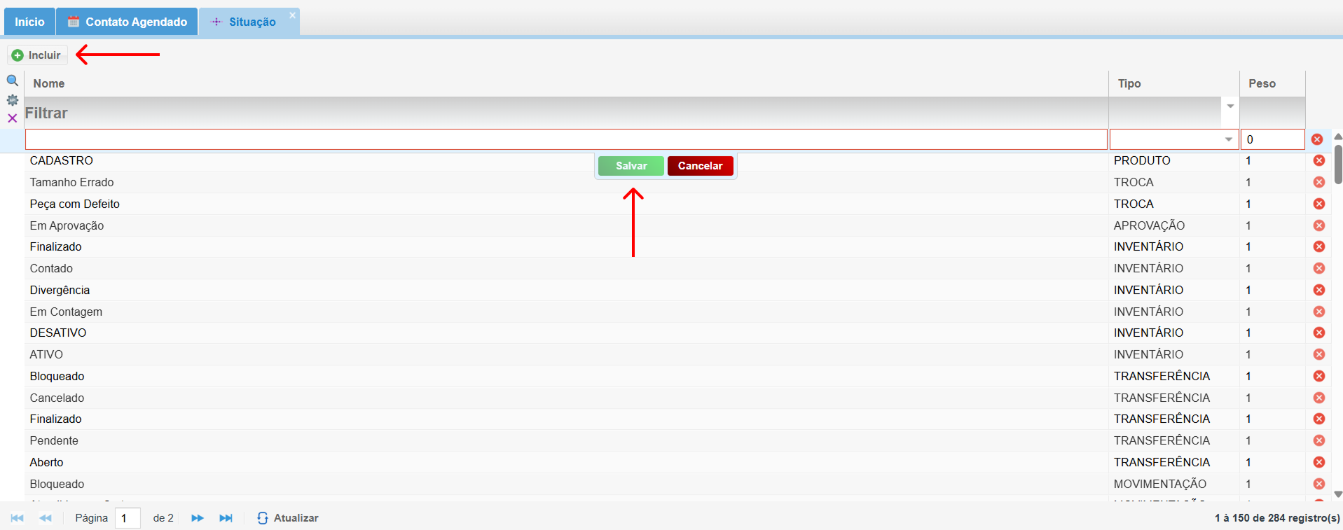 - Tipo: Determine a área do sistema onde a situação será aplicada, como produto, troca, fluxo, cor, pessoa, movimentação ou desconto.