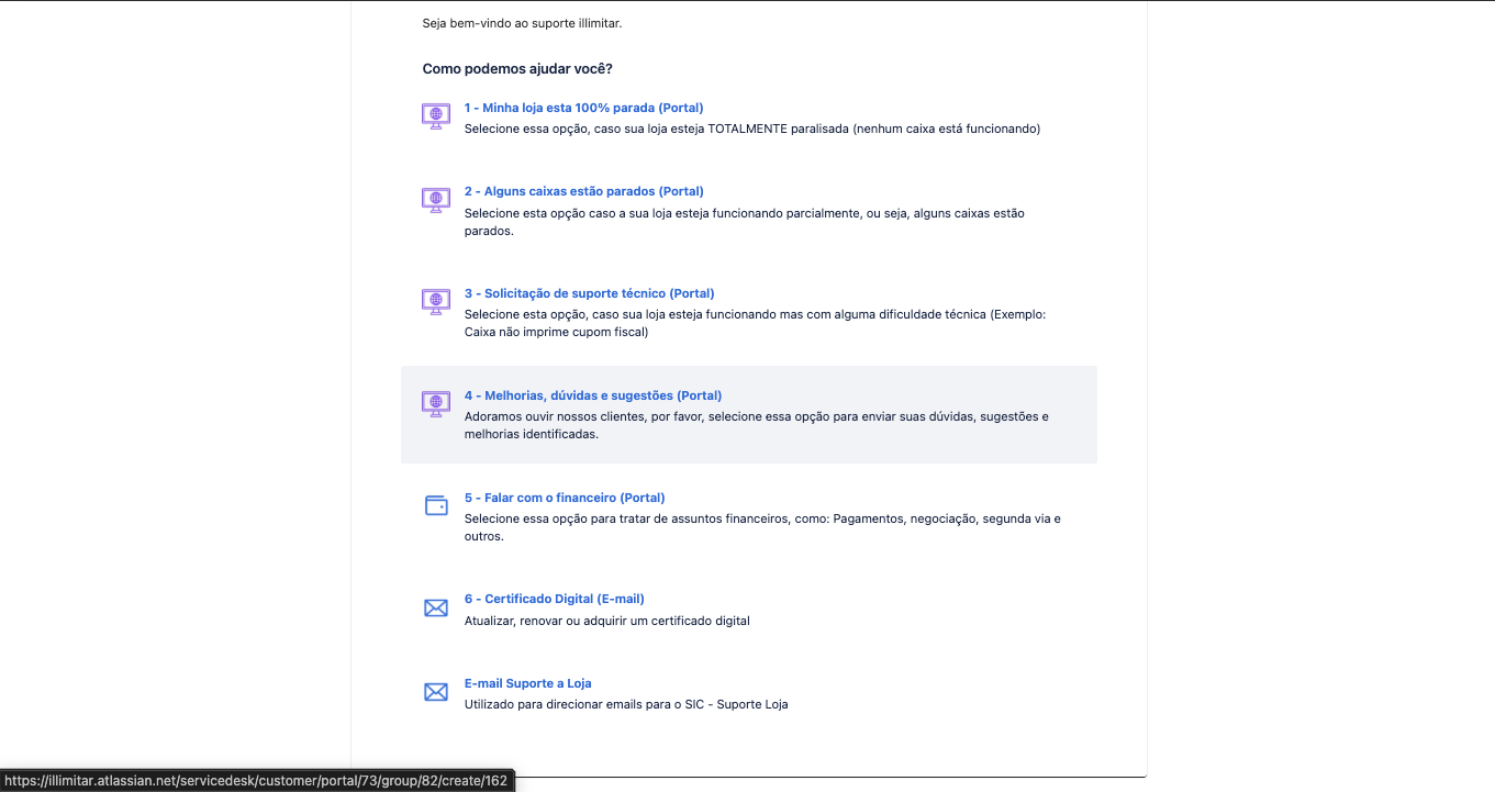 - Melhorias, dúvidas e sugestões: selecione esta opção para enviar suas dúvidas, sugestões e melhorias identificadas.