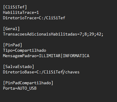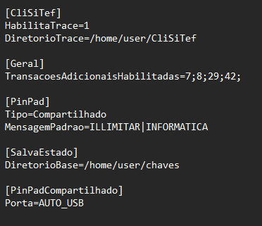 Nota: O arquivo é dividido por seções, como [CliSiTef], [Geral], etc. Se a seção ou a linha não existir, você pode adicioná-la.