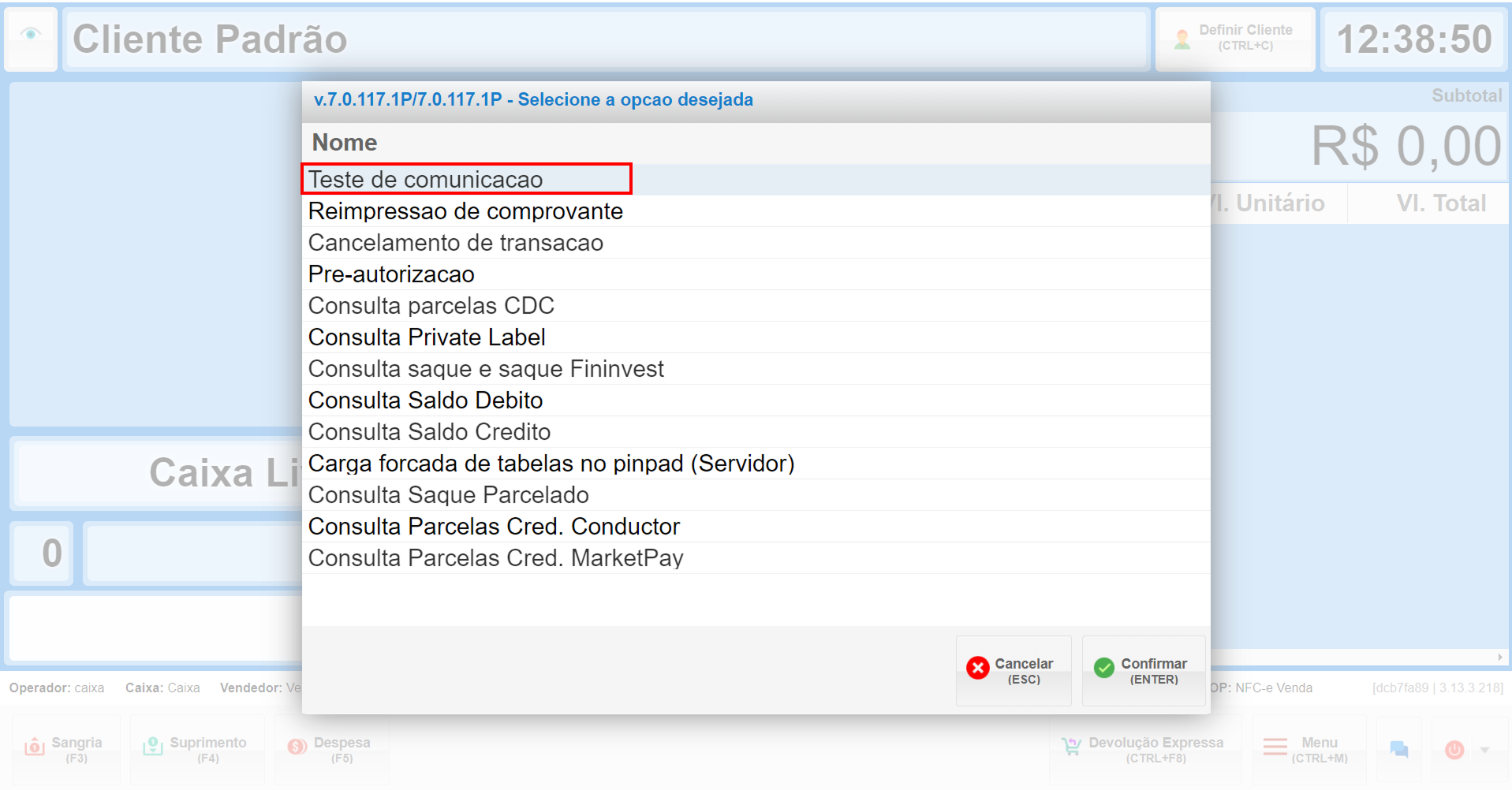 - Assim que a SkyTef confirmar a liberação, volte ao PDV e faça o teste de comunicação novamente.