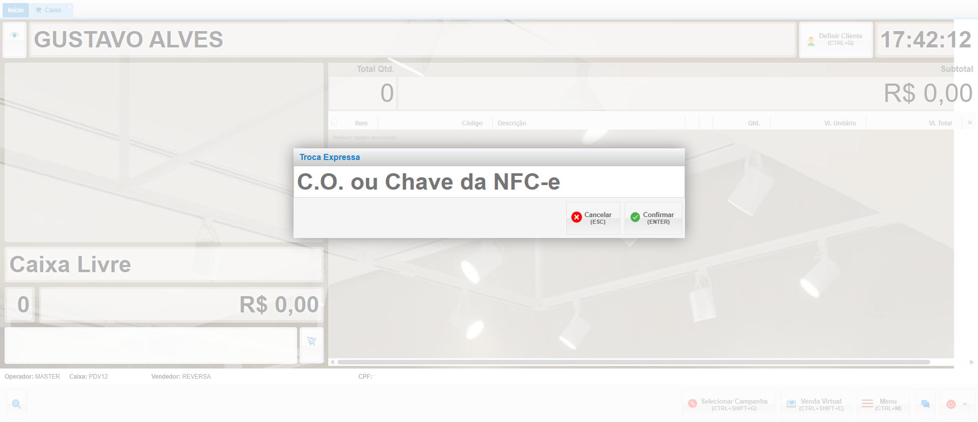 Com o cliente já identificado e o Modo de Troca Expresso ativado, informe o item de origem.