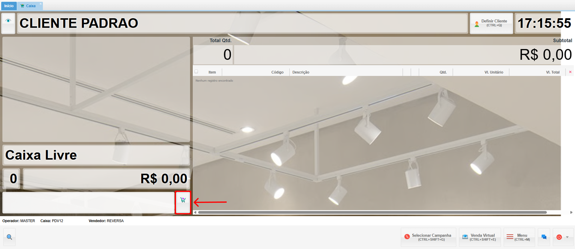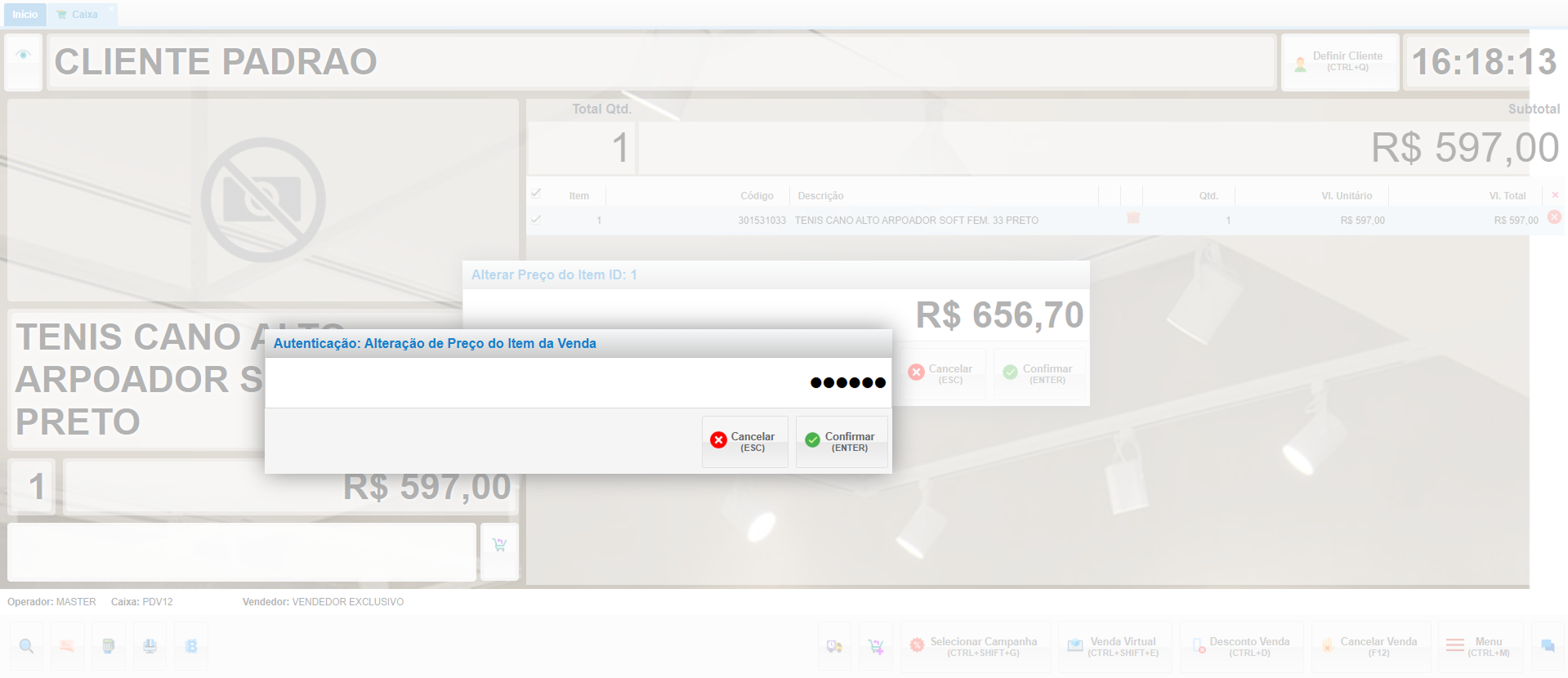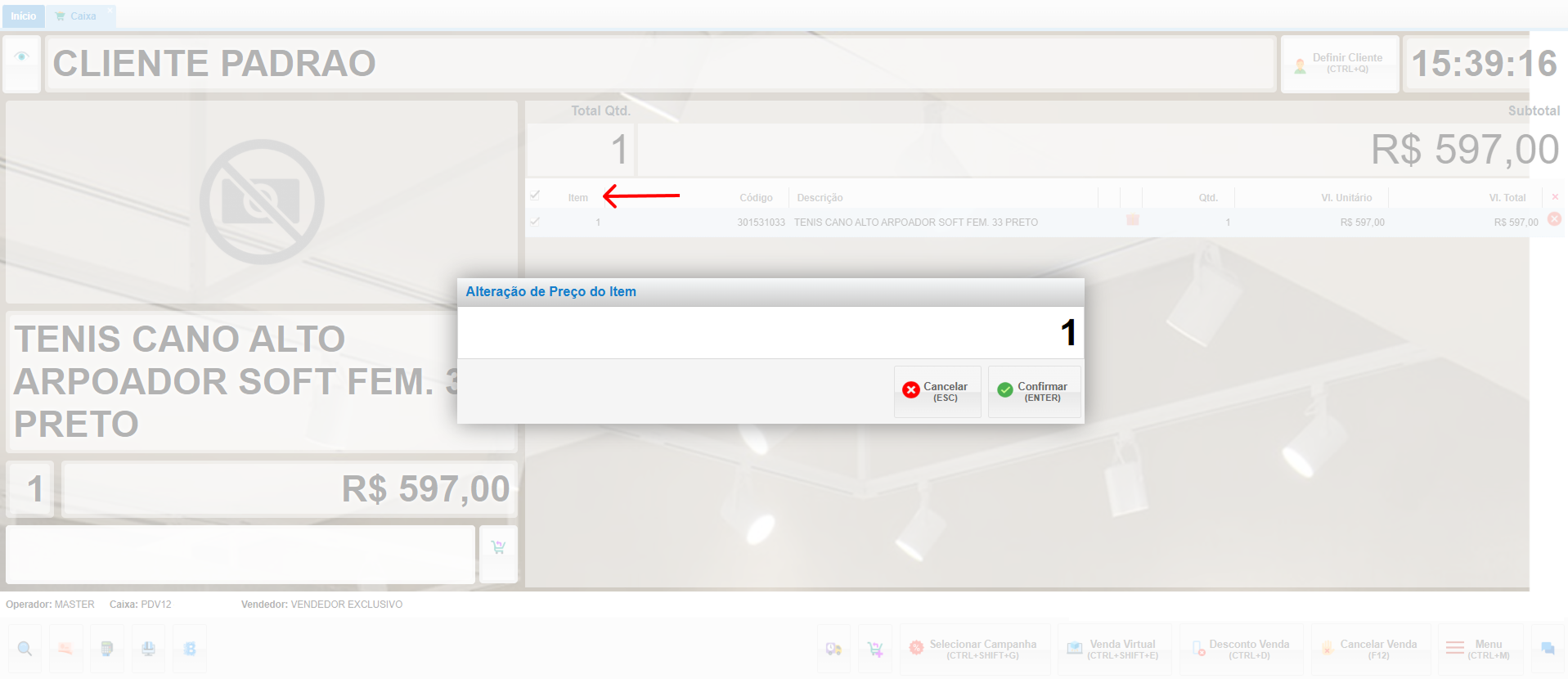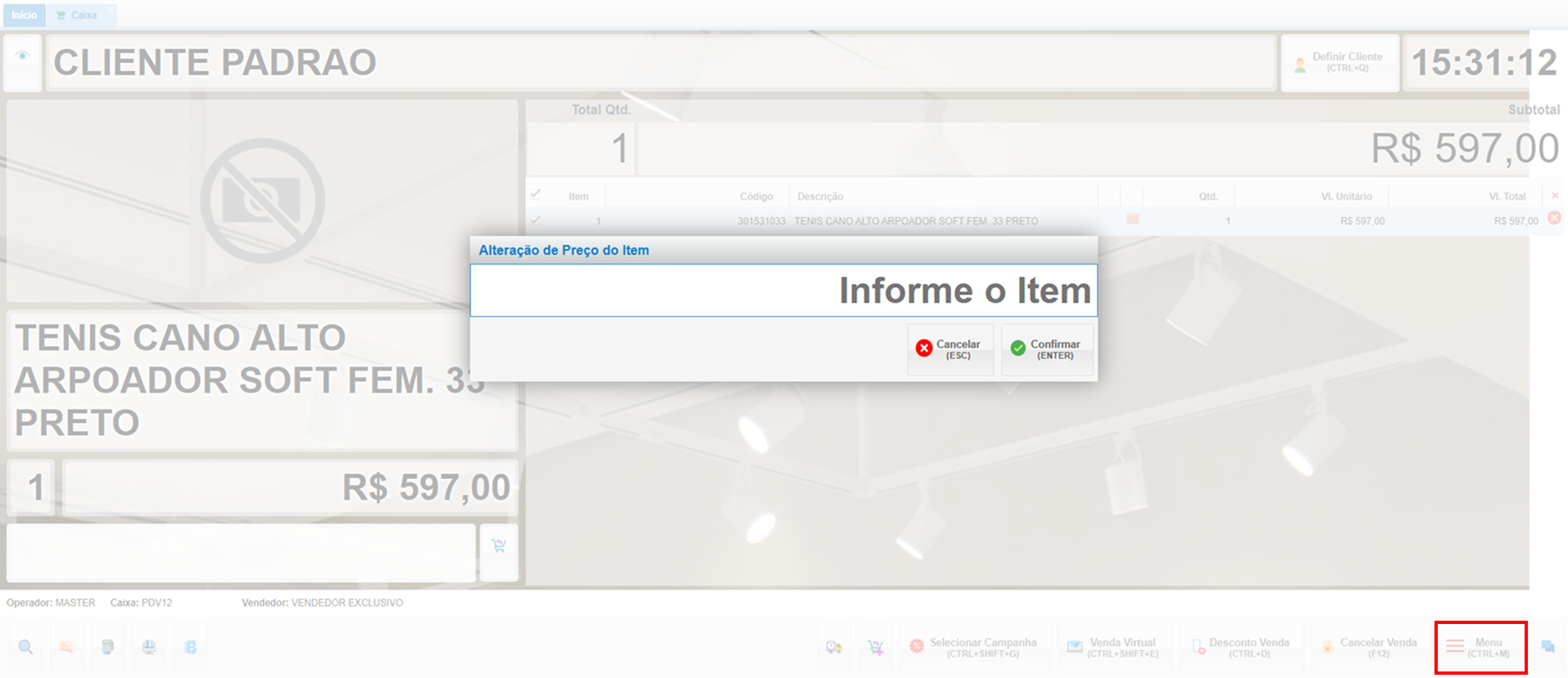 Após adicionar o produto, acesse o Menu e selecione "Alteração de Preço do Item" ou utilize o atalho CTRL + P.