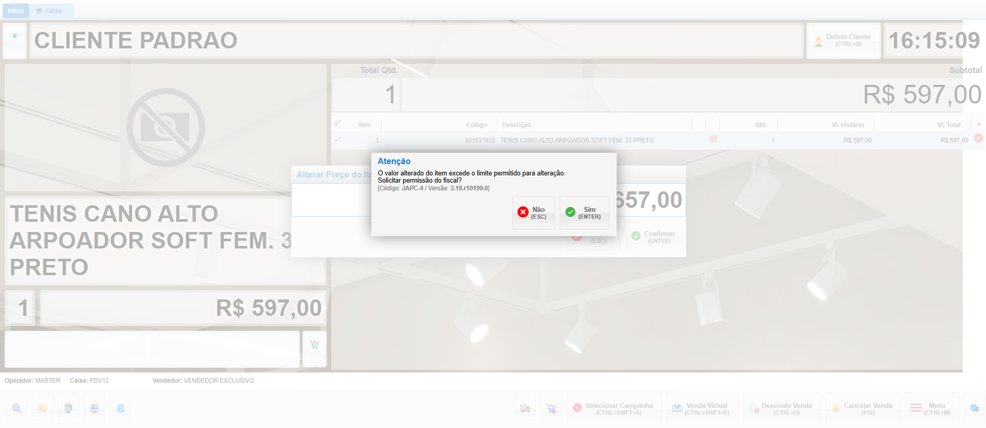 Ex: Se o responsável tiver o limite de alteração de preço de 10% e o desconto exceder esse porcentual, mesmo que por poucos centavos, o sistema informará que o limite foi excedido e exigirá o valor correto.