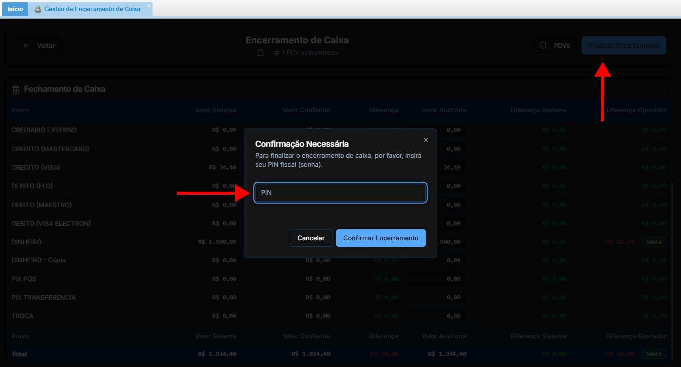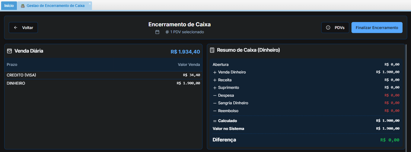 - A tela de Encerramento de Caixa será carregada automaticamente.