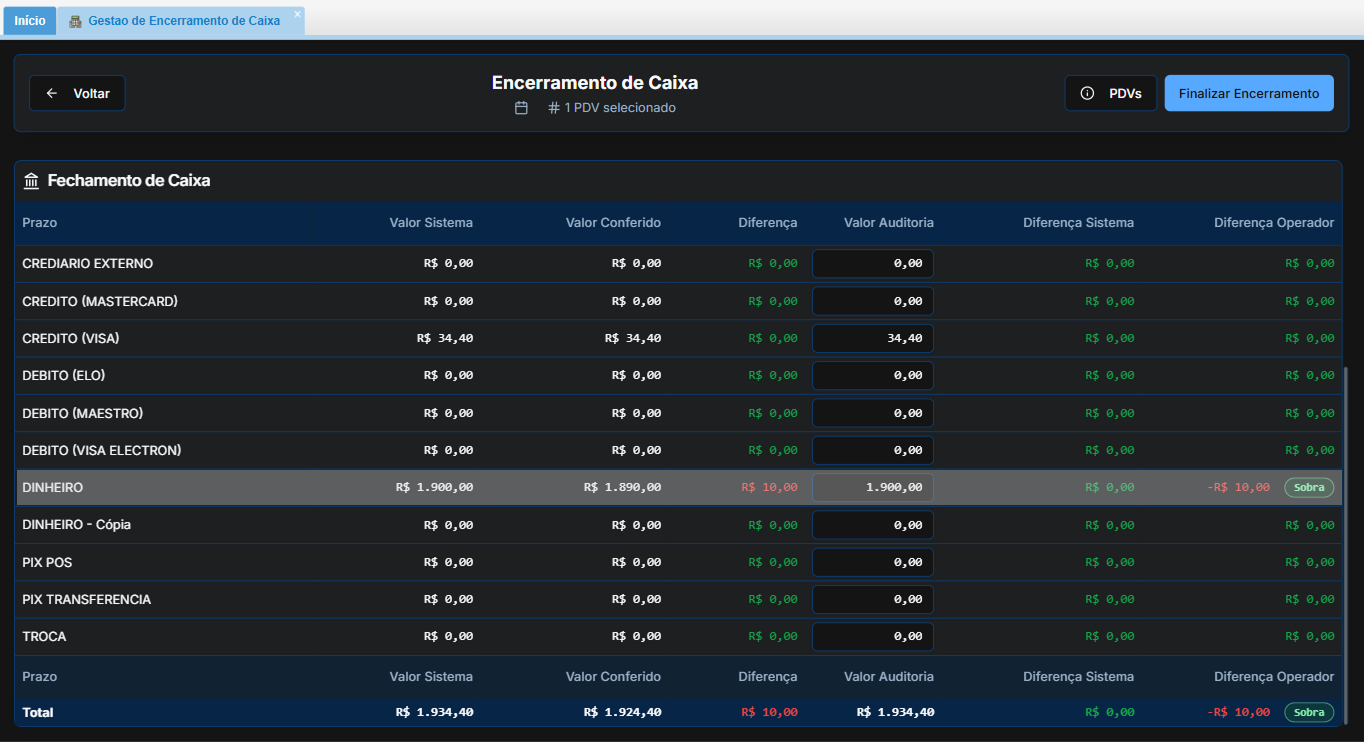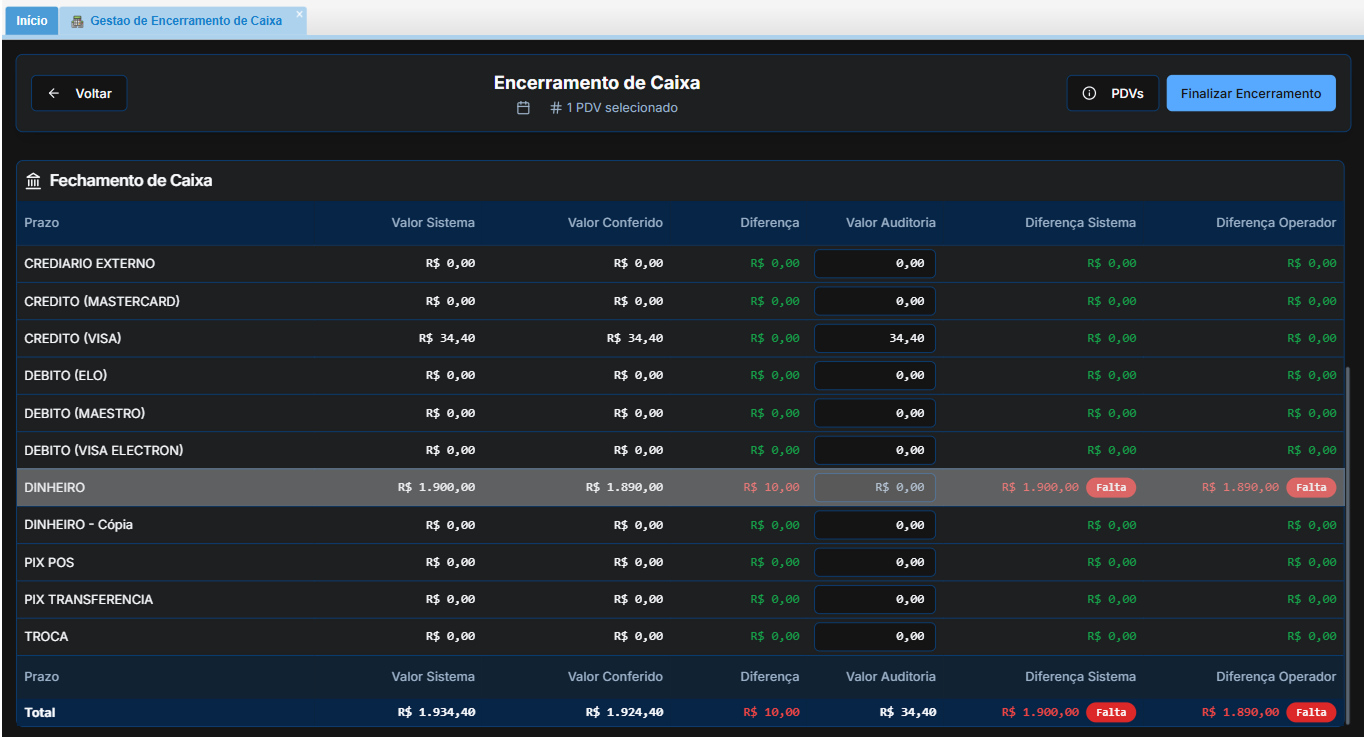 Na grade central, você verá as colunas Valor Sistema, Valor Conferido (digitado pelo operador) e Diferença.