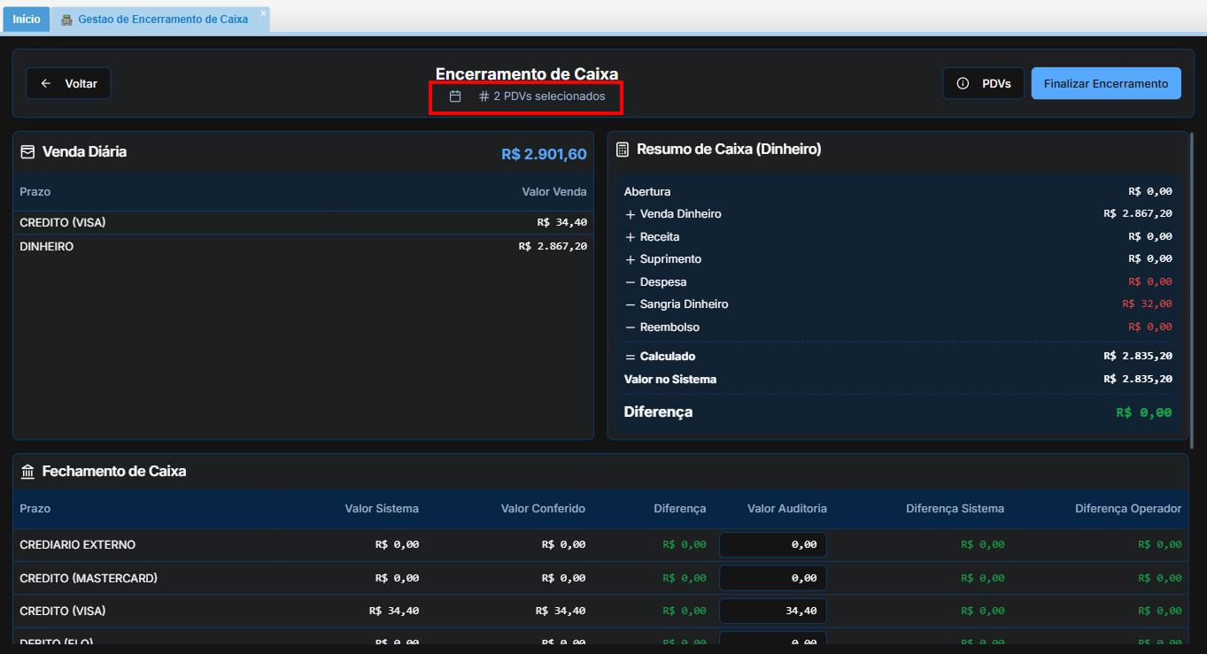 Fechamento em Lote: Você pode selecionar vários caixas na listagem inicial e clicar em Encerrar Caixas. O sistema somará os valores de todos os caixas selecionados para uma conferência unificada.