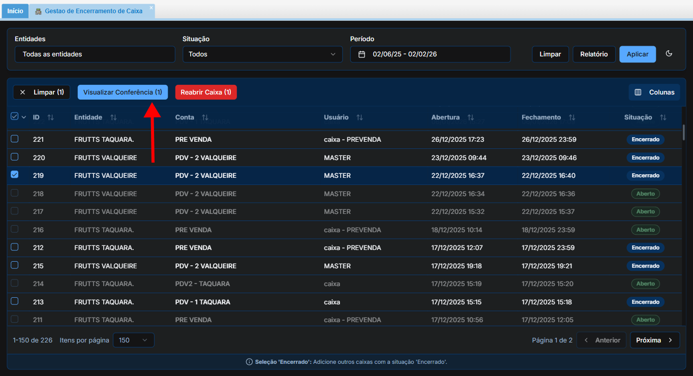 - Na listagem principal, clique sobre a linha do caixa que deseja conferir para selecioná-lo.