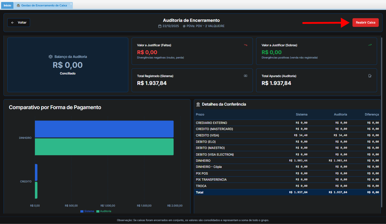 Caso precise corrigir algo, clique no botão Reabrir Caixa dentro da auditoria ou na listagem principal.
