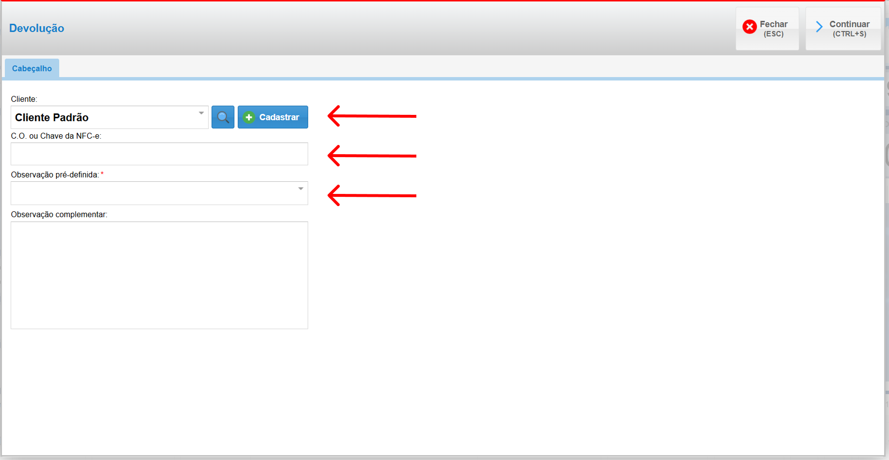 Após preenchido o Cabeçalho, clique no botão Continuar.