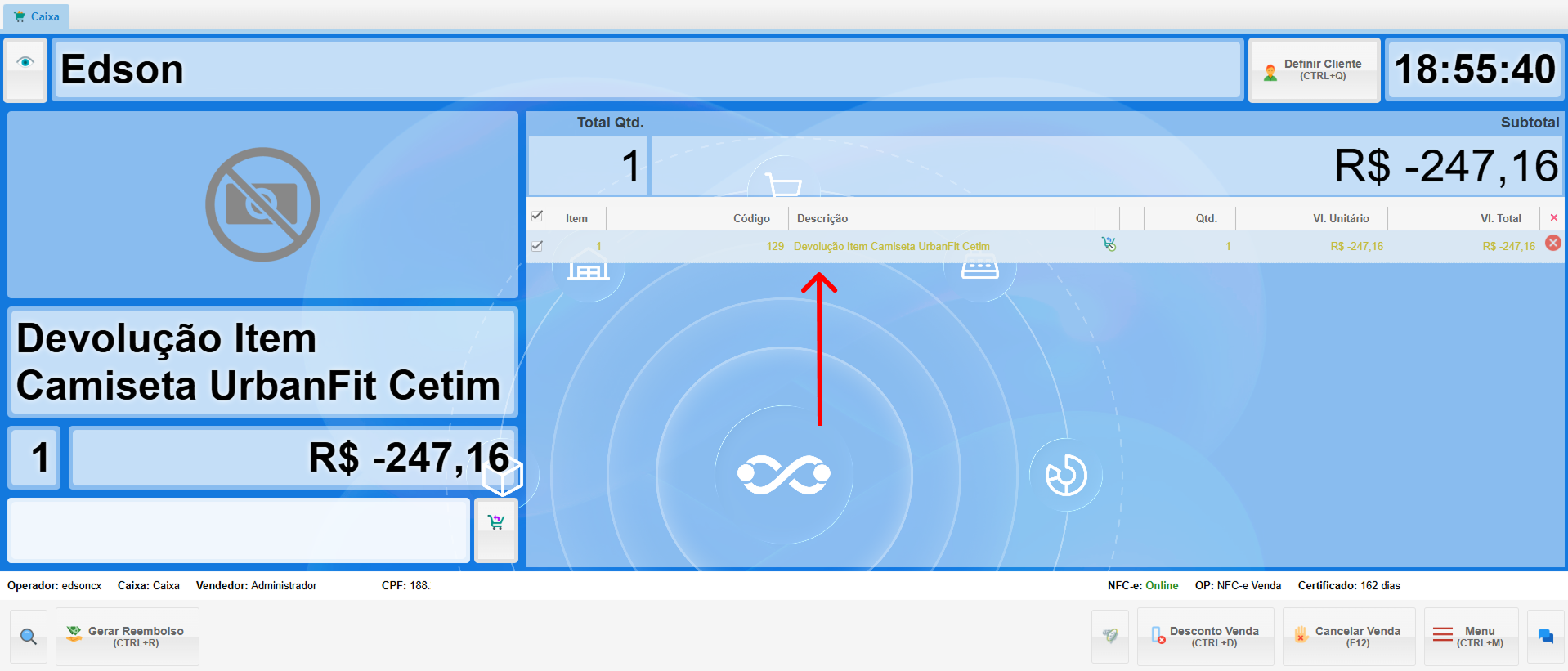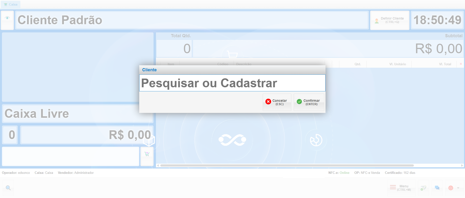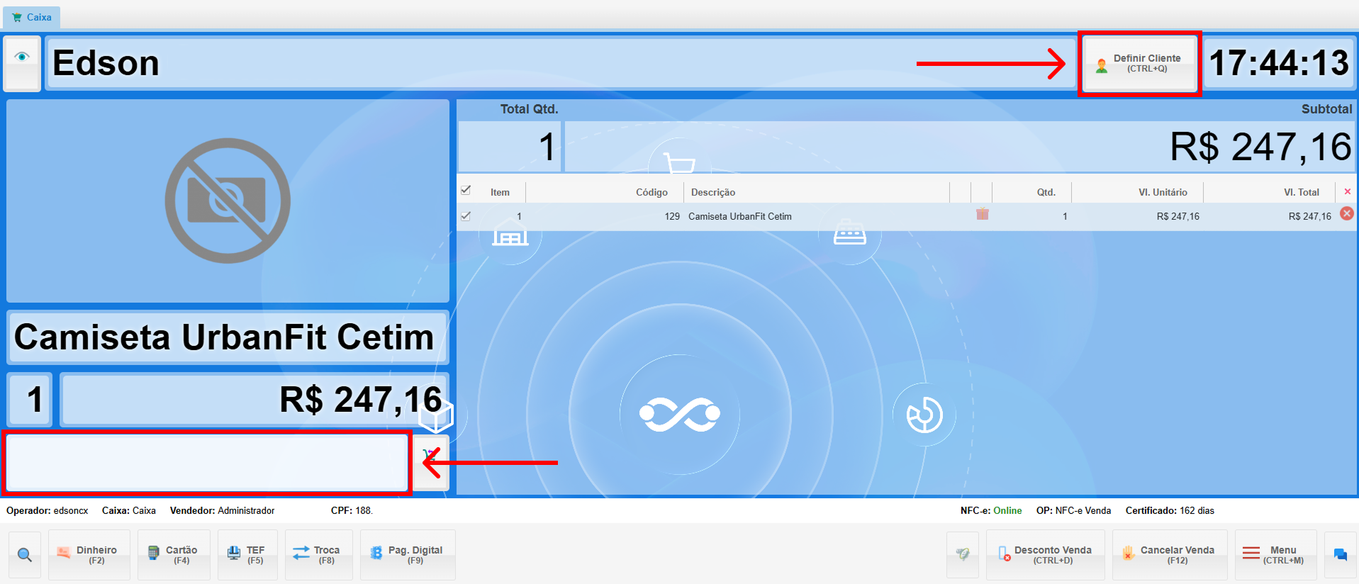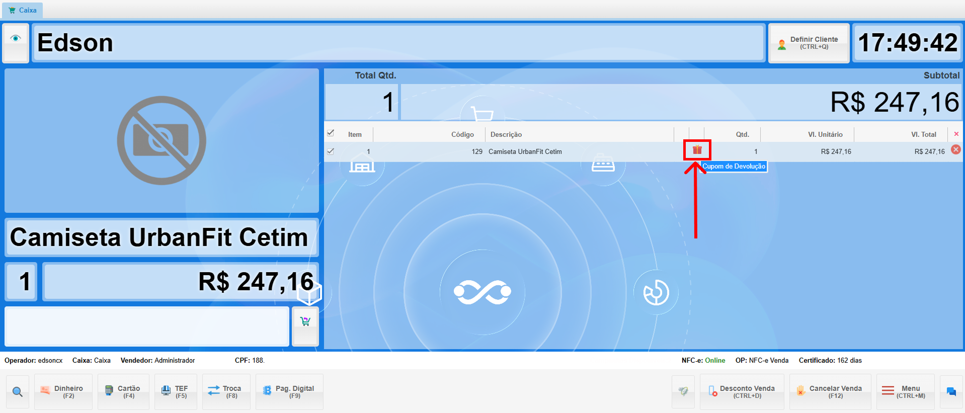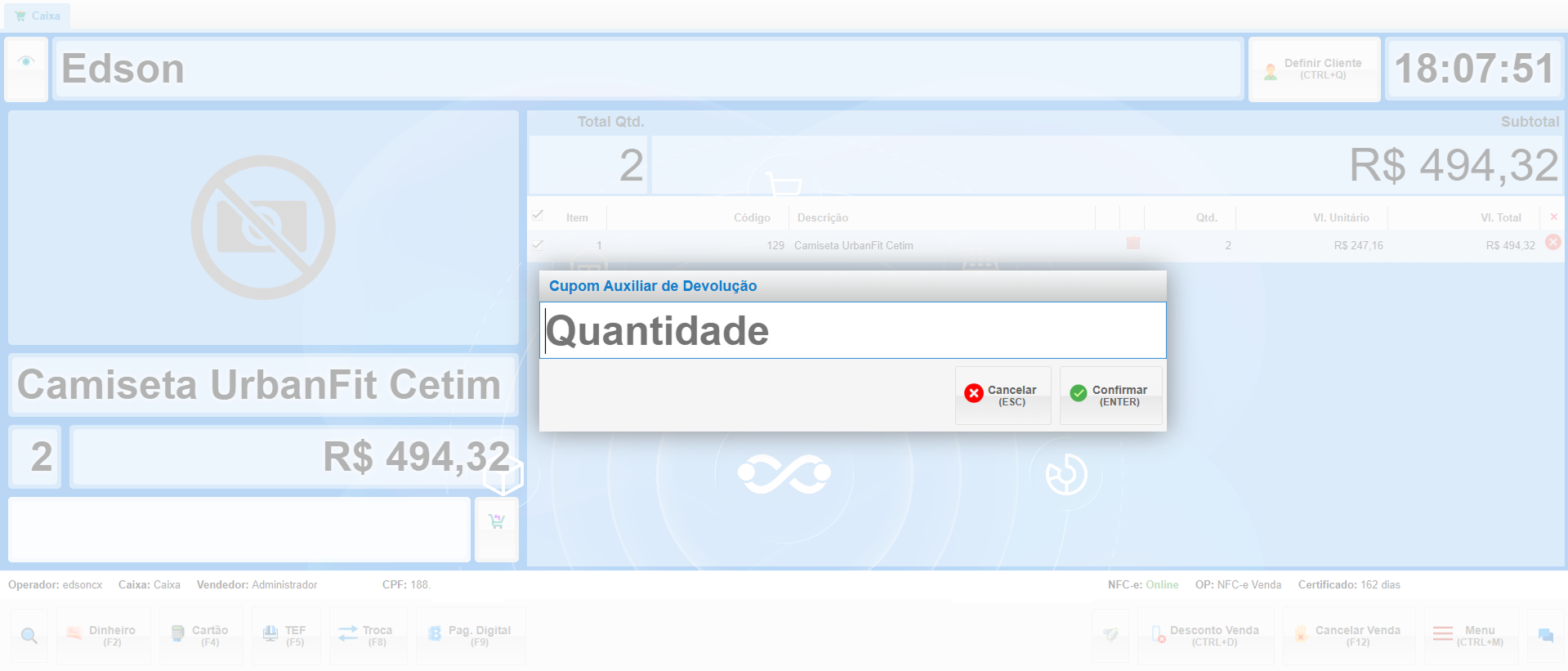 O sistema pedirá a identificação do cliente. Insira o mesmo utilizado na venda, podendo ser o CPF ou o Nome Completo.