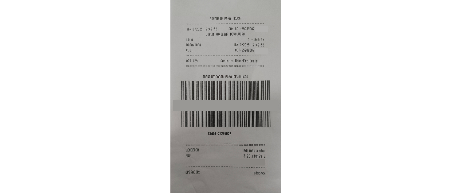 Exemplo: Se houver duas camisas com o mesmo código no carrinho, e for selecionada a opção de 2 quantidades, o sistema imprimirá dois cupons auxiliares de devolução para esse produto. Cada cupom corresponde a uma unidade:
