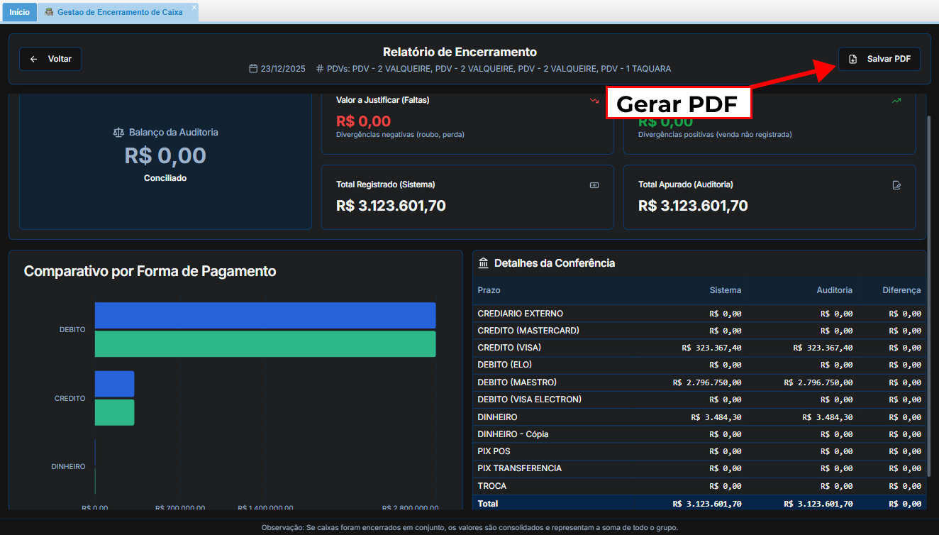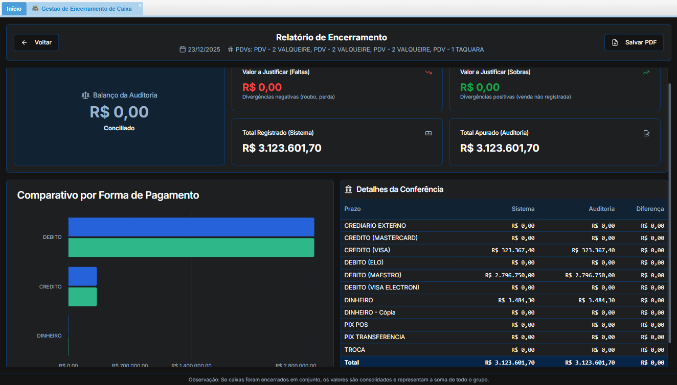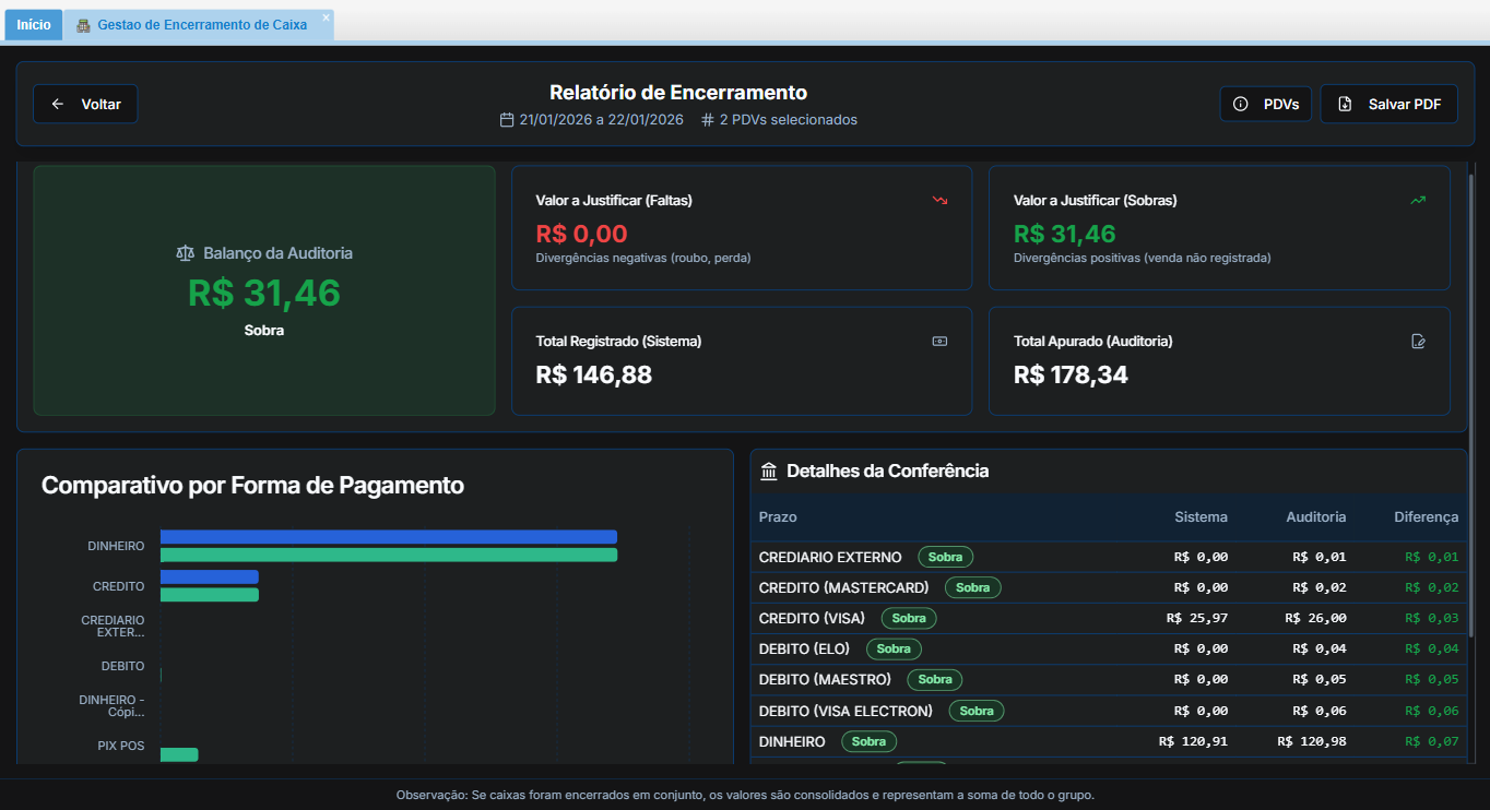 O módulo Gestão de Encerramento de Caixa foi desenvolvido para otimizar a rotina do tesoureiro ou gestor financeiro. Através dele, é possível realizar a conferência detalhada das movimentações, garantindo segurança e agilidade no fechamento financeiro da sua loja.