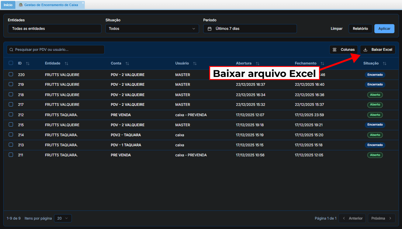 Esta opção é útil quando você cria filtros personalizados e precisa trabalhar esses dados específicos externamente. O botão Baixar Excel exporta exatamente o que está aparecendo na lista da tela principal.