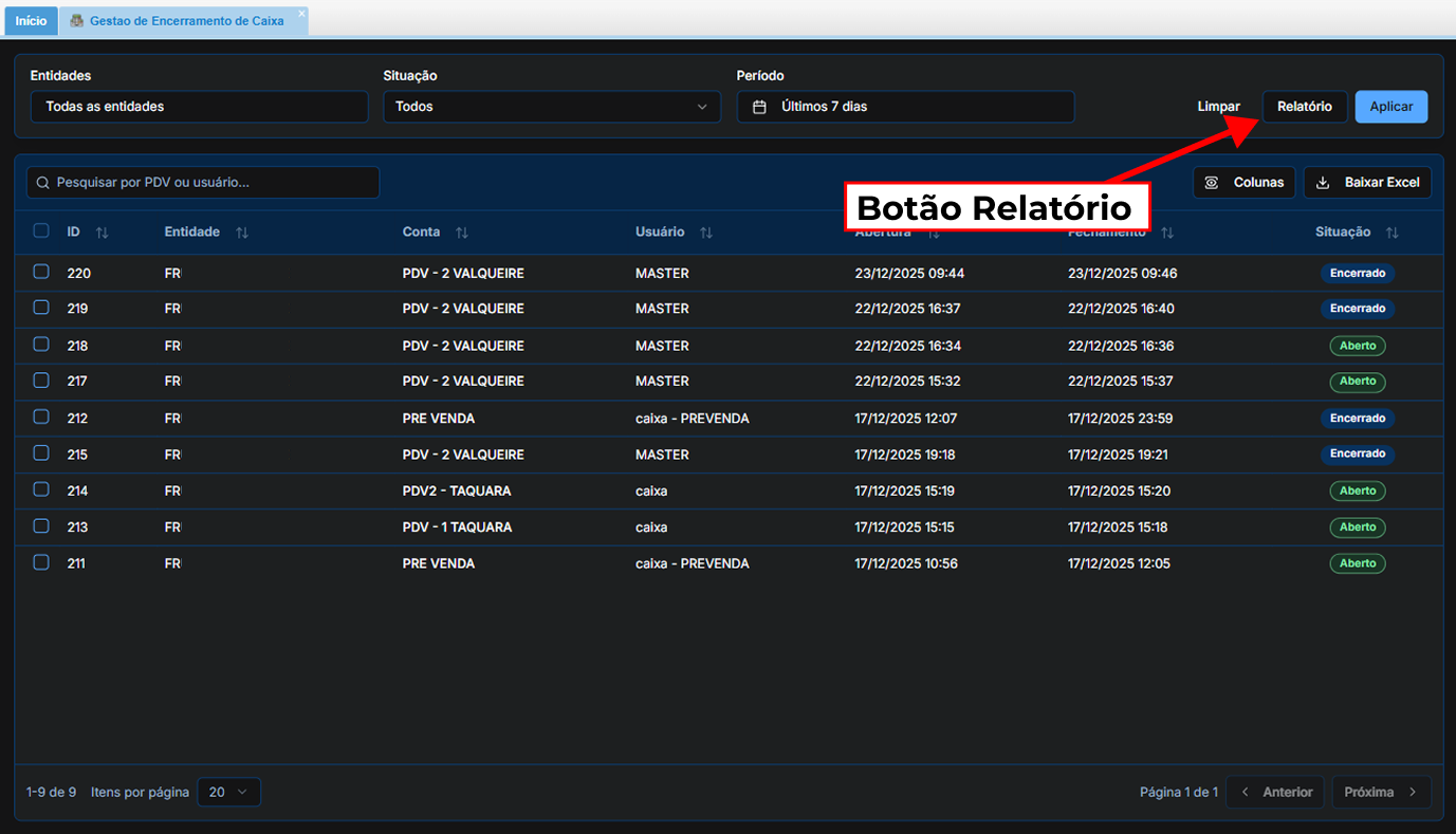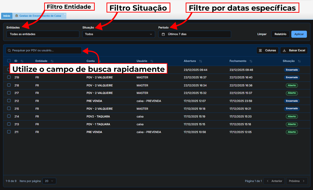 Nota: A coluna "Situação" refere-se sempre à situação da conferência feita pelo gestor financeiro, e não tem ligação com o status do caixa físico.