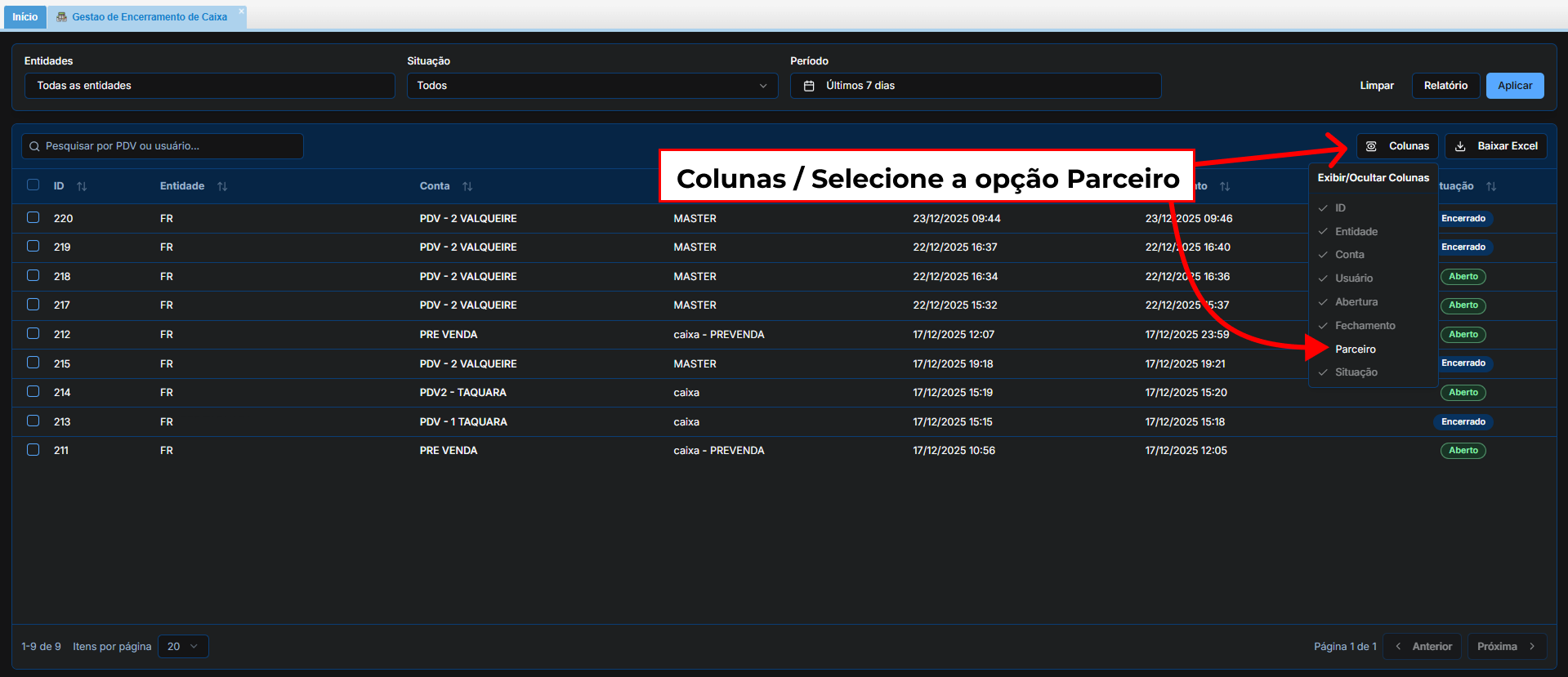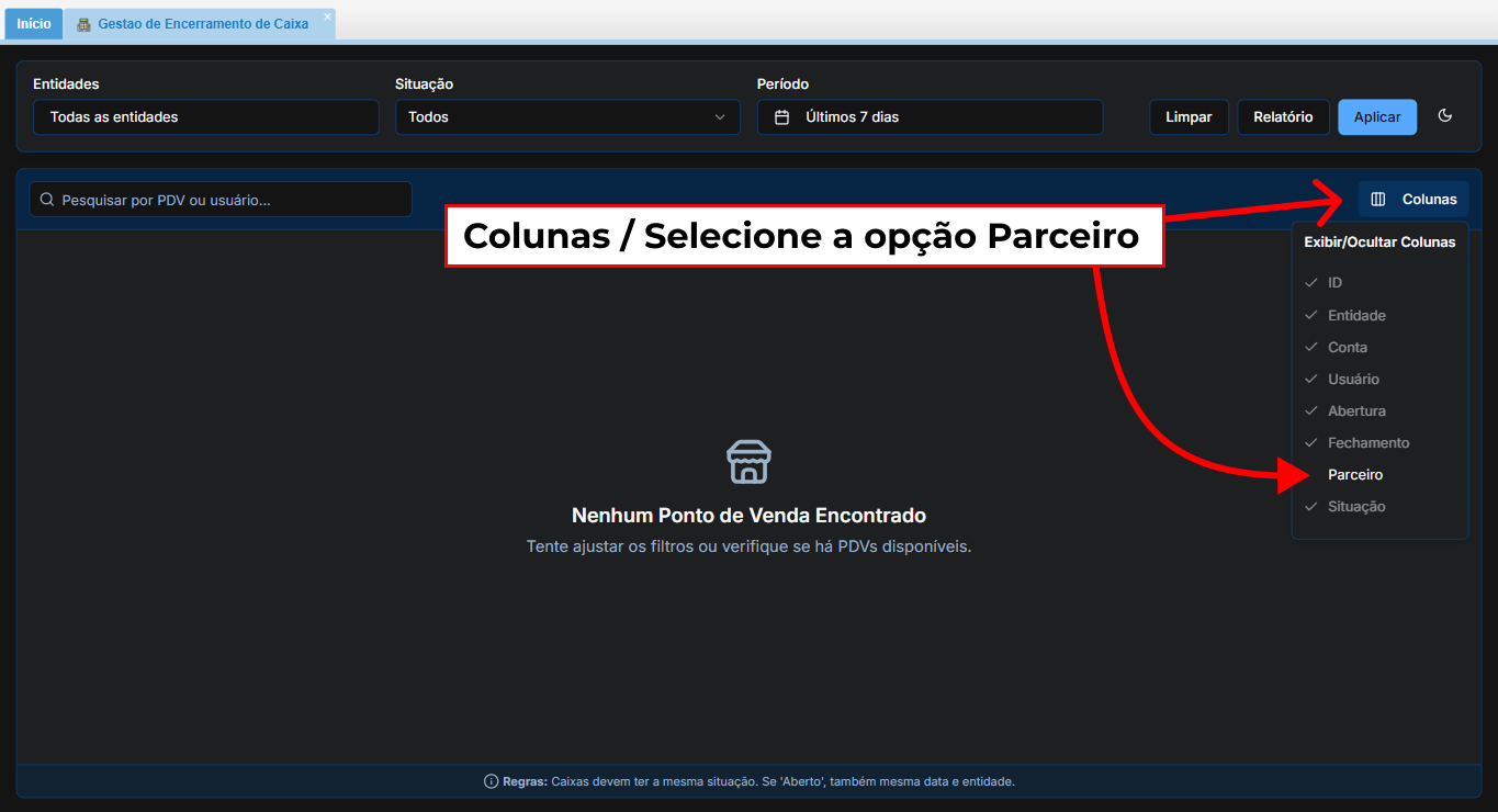 Clique no botão Colunas. Selecione a opção Parceiro.