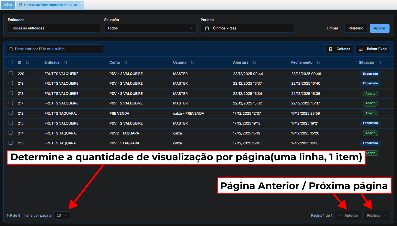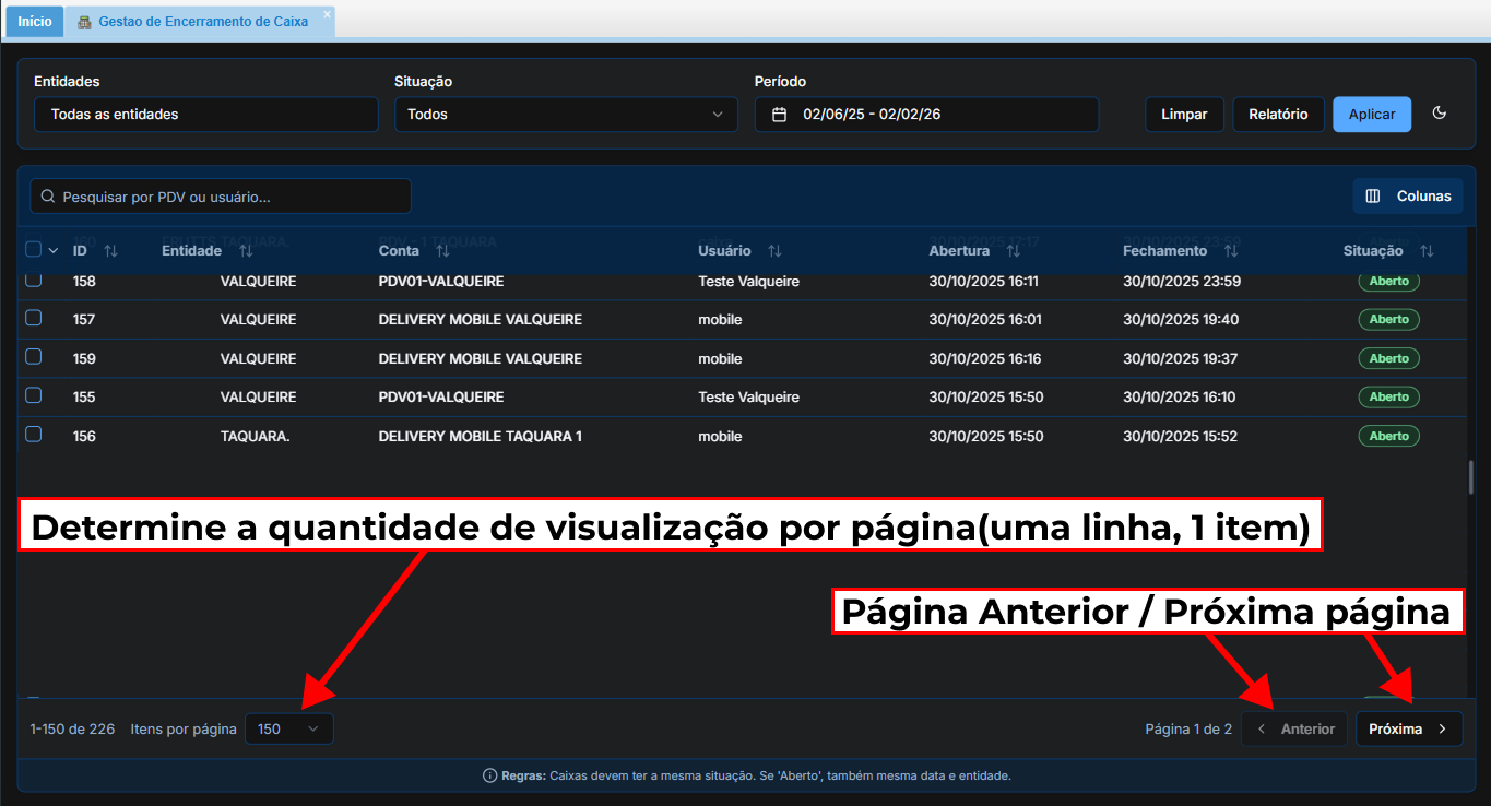 Caso a lista de caixas seja extensa, você pode navegar entre as páginas:
