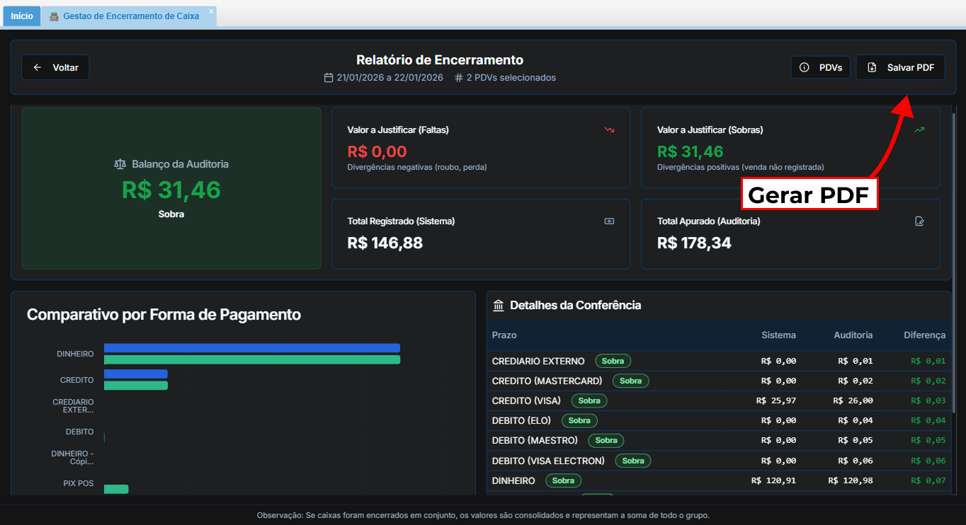 - Botão PDVs: Caso queira conferir quais pontos de venda estão inclusos no relatório gerado, clique no botão PDVs, localizado ao lado do botão Salvar PDF.