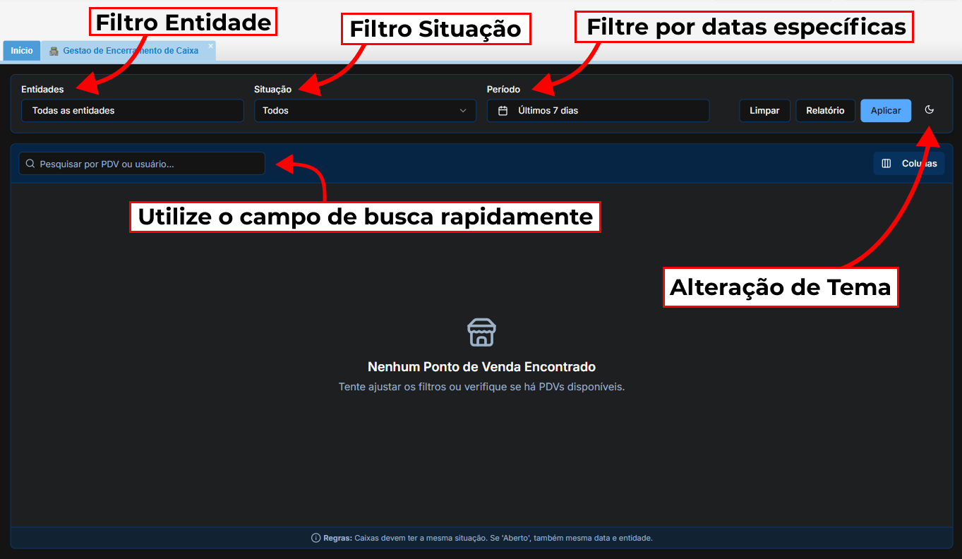 Importante: Nesta tela, serão listados apenas os caixas que já foram encerrados pelos operadores de loja (com data e hora de fechamento). Se o caixa do operador ainda estiver aberto, ele não aparecerá nesta lista para conferência.