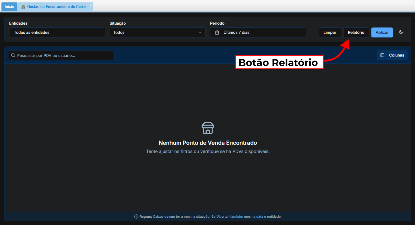 💡 Nota: O botão Relatório ignora o filtro de "Situação" (buscando sempre os encerrados), mas respeita o filtro de Período caso você queira delimitar as datas.